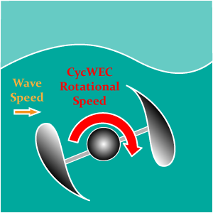 The CycWEC achieves this feat by rotating in sync with the incoming wave, so that it performs one revolution with each wave passage. In order to match the wave height, the pitch of the CycWEC blades is adjusted - the larger the wave height, the larger the blade pitch angle.