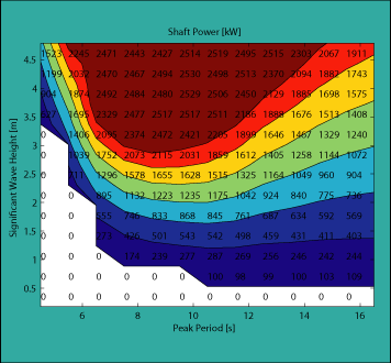 This particular power matrix belongs to a CycWEC design with a diameter of 12m, foil chord length of 5m and foil span of 60m. The total maximum generator power is 2.5MW. The CycWEC is able to produce its design power for a large range of sea states, which indicates high annual power production. In a wave climate with 30kW/m average annual wave power, for which this design was optimized, the CycWEC converts on average 38% of the wave energy to electricity, and produces about 5.4GWh per year.
