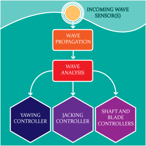 The CycWEC achieves this feat by rotating in sync with the incoming wave, so that it performs one revolution with each wave passage. In order to match the wave height, the pitch of the CycWEC blades is adjusted - the larger the wave height, the larger the blade pitch angle.