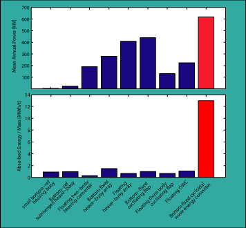 A recent study performed by Atargis Energy compares the CycWEC design to many other wave energy converters for which performance data has been published. Two of these performance metrics are shown on the left: The average annual power production, and the the energy produced per year divided by the mass of the device. The latter is an important metric since a device with higher energy production per weight will produce a lower cost of energy, since it is less expensive to construct