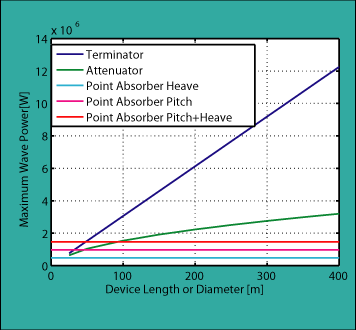 The plot to the left shows the maximum power that each class of wave energy converter can extract from an ocean wave with a significant height of 2m and wave period of 8s. It is an upper limit that can not be exceeded and was determined using analysis of the waves radiated by each device. An actual wave energy converter would likely only deliver about half of the power as electricity due to viscous losses as well as losses in the power takeoff system. As a result, only the wave Terminator can produce MW scale electric power. For larger sizes it can deliver similar power as modern wind turbines.
